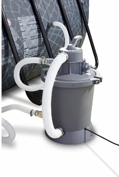 De meegeleverde zandfilterpomp zorgt voor een effectieve filtering van vuildeeltjes in het water. Dit watercirculatiesysteem pakt zelfs de kleinere deeltjes aan en is veel effectiever dan een filterpomp met cartridges. In het filtermateriaal blijft vuil zoals zand, algen en insecten achter. Zo weet je zeker dat een frisse duik in dit zwembad ook echt een frisse duik blijft. De zandfilterpomp heeft een capaciteit van 3028 liter per uur, waardoor de volledige inhoud in minder dan 5 uur wordt rondgepompt. Deze zandfilterpomp wordt geleverd zonder het benodigde filterzand, vergeet dit niet bij je bestelling mee te bestellen. Voor deze zandfilterpomp heb je 10 kg filterzand nodig.